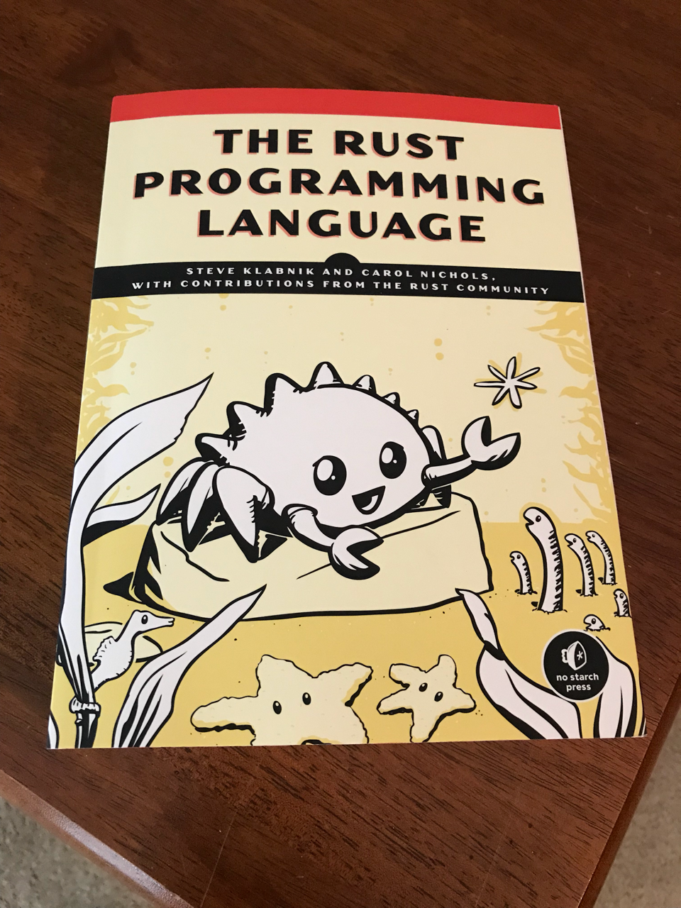 my copy of The Rust Programming Language arrived! this is really cool to hold, and kinda surreal thinking of what it would have been like if i had found this book eight years ago in my collegeโs library