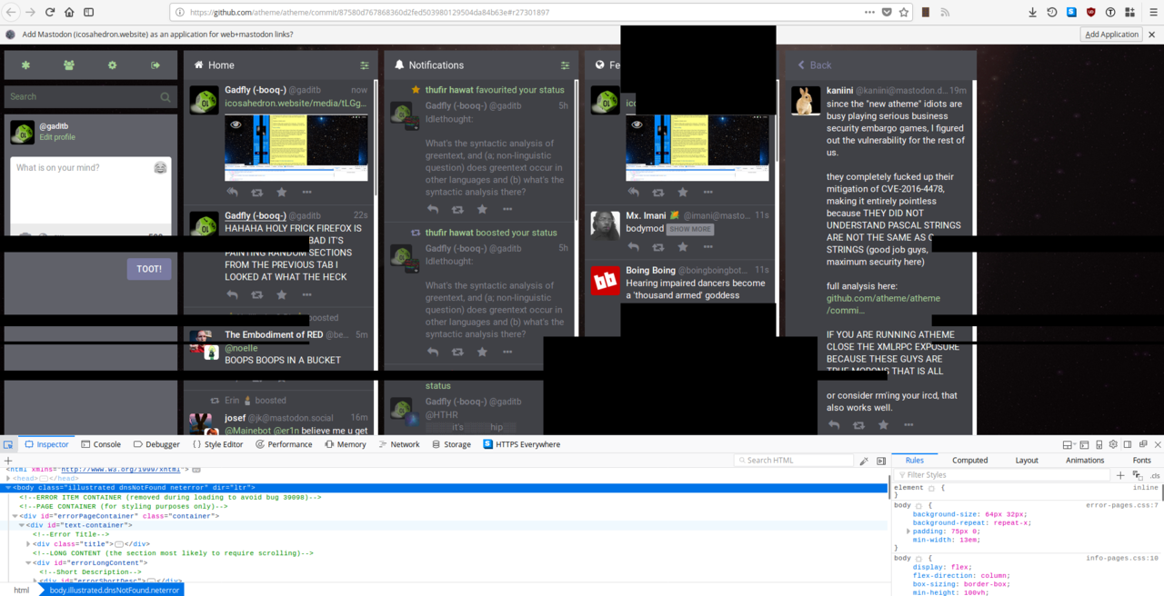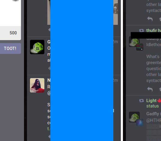 OH! Yeah, 64bit GNU/Linux. I can give more specific specs when like actually filing an actual bug report and stuff and not just live-tooting it.